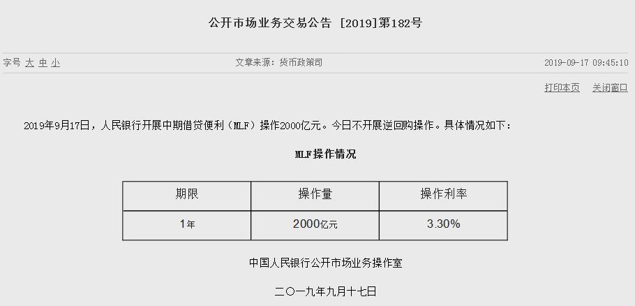 今年8月17日,央行发布公告称,为深化利率市场化改革,决定改革完善贷款市场报价利率(LPR)形成机制,报价方式改为按照公开市场操作利率加点形成,其中公开市场操作利率主要指MLF利率。也就是说,如果MLF利率下调,LPR利率及企业融资利率还有进一步下降的空间。这一改革实现了贷款利率与MLF利率挂钩,可通过下调MLF利率带动贷款利率下行,被市场认为是今后新的“降息”方式。