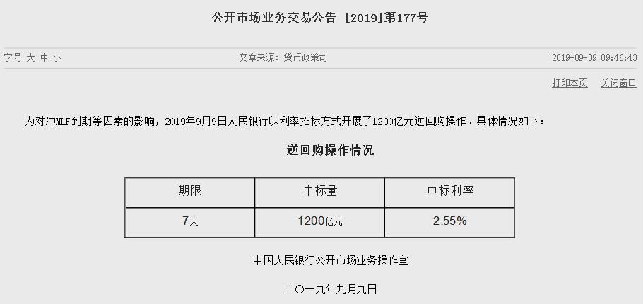 数据显示,9月有两笔MLF到期,分别于9月9日到期1765亿元,9月17日到期2650亿元。对于9月9日到期MLF,央行在当日选择以逆回购进行对冲,中标量达1200亿元,期限为7天,中标利率为2.55%。