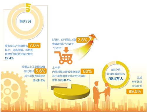 8月份,国民经济运行主要指标有升有降,工业生产略有放缓,服务业增长加快,市场销售保持稳定,投资略有放缓。在一系列措施作用下,就业保持稳定,为中国经济保持稳定增长奠定了很好的基础。内需已经成为经济增长的主要动力,消费增长处于需求升级和扩大加快的阶段。