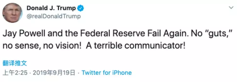 美联储降息后,特朗普立即发推称:(美联储主席)鲍威尔和美联储又一次失败了。(他们)没有“胆量“,没有道理,没有远见!是一个糟糕的沟通者!