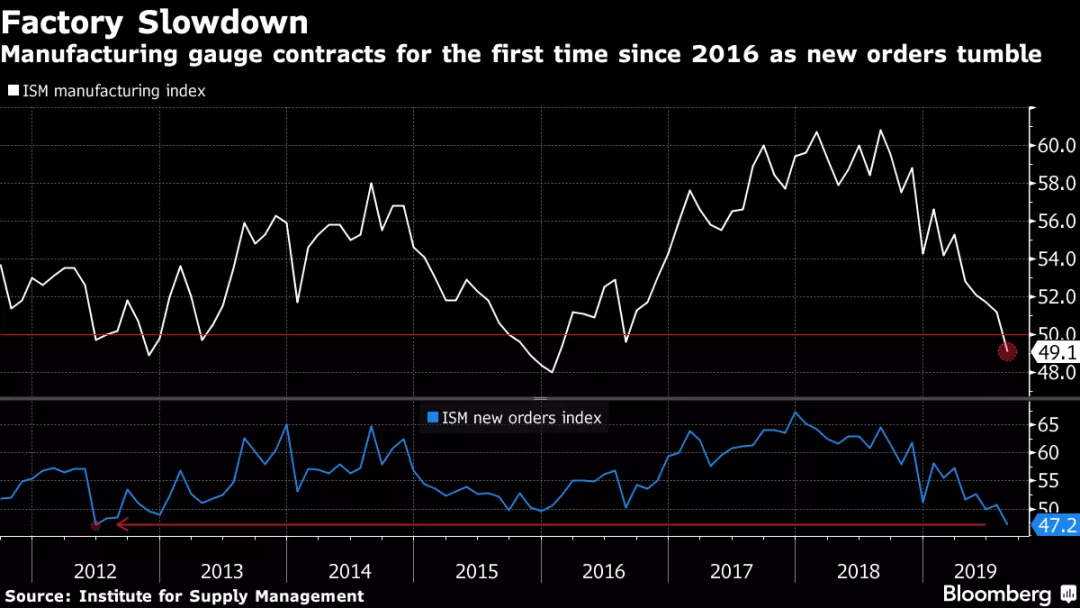 本月初,美国供应管理协会(ISM)发布的数据显示,8月份美国制造业PMI为49.1,远低于预期的51.3,为2016年1月以来最低水平,且是2016年8月以来首次跌破50的荣枯线。同日晚间IHS Markit公布的数据也显示,8月美国制造业PMI放缓至50.3,为2009年9月以来的最低水平。自去年夏天以来,制造业PMI已下跌近10点。