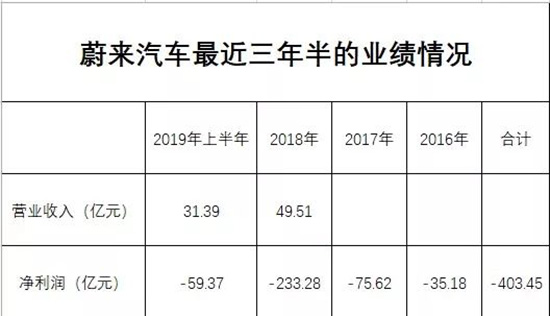 2019年上半年财年,蔚来亏损金额已经达到59.37亿元(一季度亏损26.52亿元,二季度亏损32.85亿元);2016年-2018年三年间,蔚来的亏损金额分别为35.18亿元、75.62亿元、233.28亿元;三年半合计亏损达403.45亿元。
