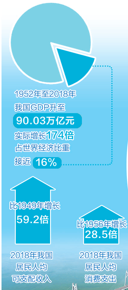 宁吉喆表示,第一,从站起来、富起来到强起来实现飞跃。1952年至2018年,我国GDP从679.1亿元跃升至90.03万亿元,实际增长174倍,占世界经济的比重接近16%;人均GDP从119元提高到6.46万元,实际增长70倍。
