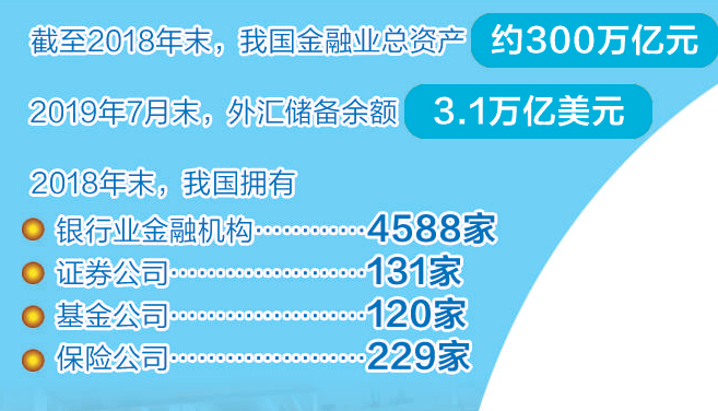 易纲表示,一是基本建成了与中国特色社会主义相适应的现代金融市场体系。2018年末,我国拥有4588家银行业金融机构、131家证券公司、120家基金公司、229家保险公司。金融业总资产约300万亿元,其中银行业总资产268万亿元,规模居全球第一。另外,债券、股票、保险市场也都成为全球第二大市场。2019年7月末,外汇储备余额3.1万亿美元,多年来居全球第一。