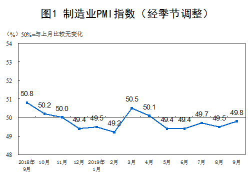 2019年9月份,中国制造业采购经理指数(PMI)为49.8%,比上月回升0.3个百分点。