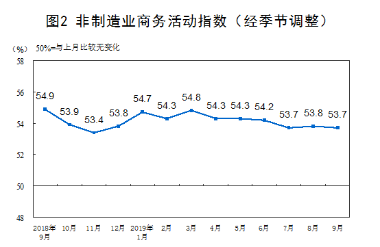 2019年9月份,非制造业商务活动指数为53.7%,略低于上月0.1个百分点,非制造业总体延续平稳扩张态势。