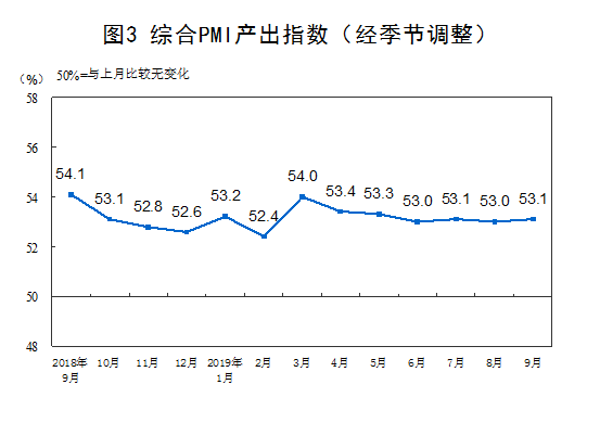 2019年9月份,综合PMI产出指数为53.1%,略高于上月0.1个百分点,表明我国企业生产运营总体平稳。