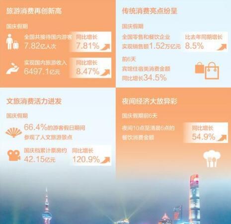 今年国庆假期,多项数据创下新高:10月1日至7日,全国实现国内旅游收入6497.1亿元,同比增长8.47%;国庆档累计票房约42.15亿元,较去年的19.08亿元,同比增长120.9%;10月1日—6日,银联网络交易总金额超过1.7万亿元,同比增27.7%。