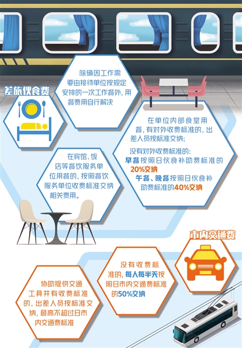 记者梳理发现,各地新规在收交标准上与中央单位差旅费管理有关规定基本一致,即除确因工作需要由接待单位按规定安排的一次工作餐外,用餐费用自行解决。在单位内部食堂用餐,有对外收费标准的,出差人员按标准交纳;没有对外收费标准的,早餐按照日伙食补助费标准的20%交纳,午餐、晚餐按照日伙食补助费标准的40%交纳。在宾馆、饭店等餐饮服务单位用餐的,按照餐饮服务单位收费标准交纳相关费用。
