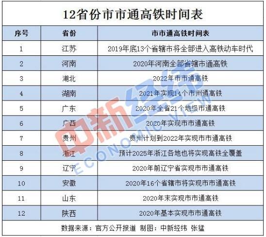 中新经纬客户端梳理发现,河南、广东、广西、辽宁、安徽、山东、陕西等7省份市市通高铁时间表集中在2020年,不难看出,2020年成市市通高铁关键年份。