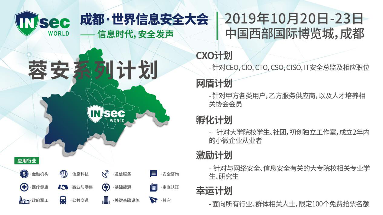 首届“INSEC WORLD成都·世界信息安全大会”,将网络安全领域目光聚焦于中国西部软件大都市——成都,以全新的安全会议分享模式,带来看待网络安全不同视角,打造信息安全产业打造国际交流平台。本次大会召开在即,限额福利传送门: