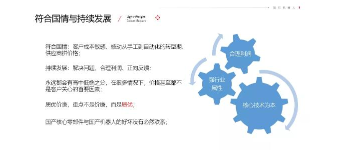 对于专用设备化的机器人,大概率会陷入到非常残酷的价格战,最终可能只剩下少数几家存活的厂商。如果是通过技术提升,掌控关键部件来降低成本,那么就是我们传统上讲的进口替代,市场空间巨大,还可以做一做。如果只会买部件来组装,缺乏持续发展所需要的利润和技术支撑,受限于市场规模和客户水平,没有核心技术只会打低级价格战的厂商在这个行业会活的比较辛苦,已经脱离了常规意义上我们讲的高端制造,在此不再细说。