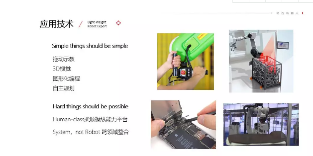 机器人要想获得更广泛的应用,必须要解决现阶段看起来难的问题,这就需要提供具备人类能力的柔顺操作平台和配套的应用软件。同时要与新行业深度绑定,进行资源和技术的跨领域整合,为客户提供系统解决方案,而不是单纯的机器人。