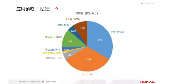 上图是2017年按行业划分的全球机器人出货量,包括汽车、3c、食品饮料、塑料、金属加工等。从图中可以非常清楚的看到,汽车和3c两个大的领域合起来占据了机器人使用量65%的份额,其他所有行业加到一块只能占到三分之一。如果再排除较为低端的金属加工以及非工业的10%的份额,用在其他行业的机器人实际上少的可怜。