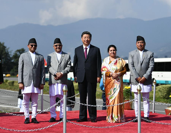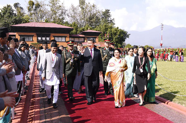 10月12日,国家主席习近平乘专机抵达加德满都,开始对尼泊尔进行国事访问。尼泊尔总统班达里在机场为习近平举行具有浓郁尼泊尔民族特色的欢迎仪式。新华社记者高洁摄