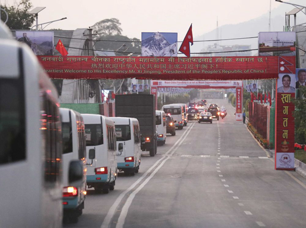 10月12日,尼泊尔首都加德满都,车队经过一道道迎宾拱门。新华社记者丁林摄