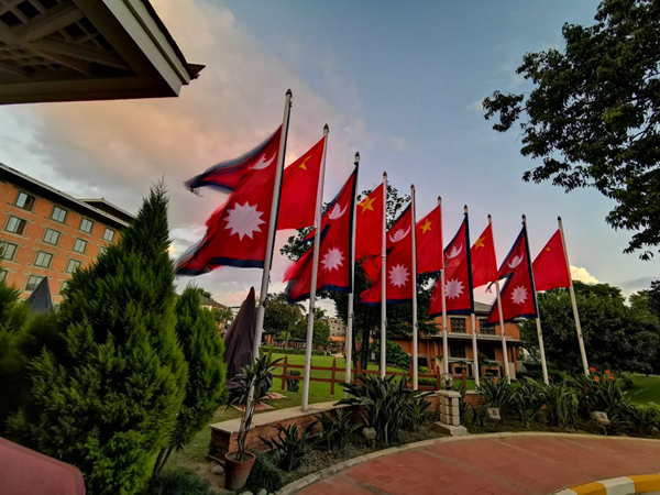 习近平主席在加德满都下榻的饭店院内飘扬着中尼两国国旗。新华社记者赖向东摄