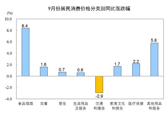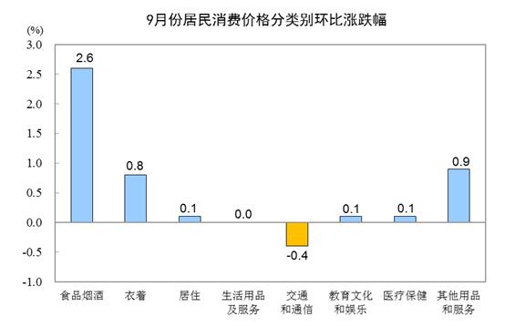 9月份,全国居民消费价格环比上涨0.9%。其中,城市上涨0.7%,农村上涨1.3%;食品价格上涨3.5%,非食品价格上涨0.2%;消费品价格上涨1.5%,服务价格下降0.1%。