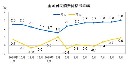 2019年9月份,全国居民消费价格同比上涨3.0%。其中,城市上涨2.8%,农村上涨3.6%;食品价格上涨11.2%,非食品价格上涨1.0%;消费品价格上涨4.0%,服务价格上涨1.3%。1-9月平均,全国居民消费价格比去年同期上涨2.5%。