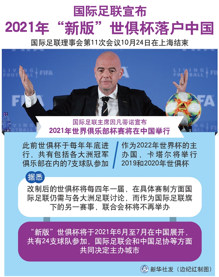 上海10月24日电(记者韦骅、马邦杰、朱翃)24日于上海结束的国际足联理事会第11次会议上,国际足联主席因凡蒂诺宣布,2021年“全新”的世俱杯将在中国举行。作为改制后的首届,2021年世俱杯“新”在哪里?
