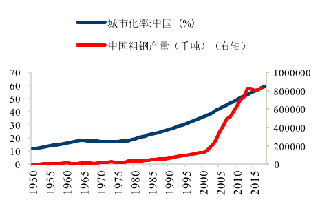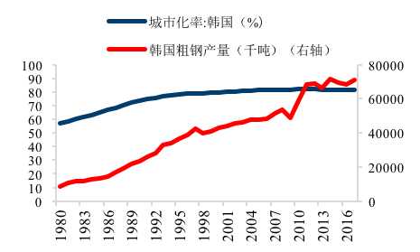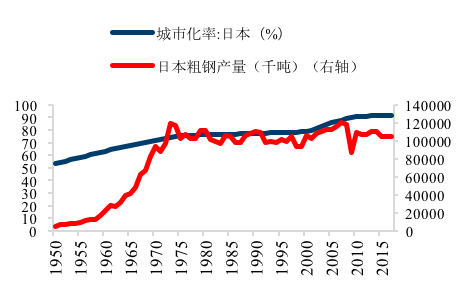 在国家城镇化率提升的早期,粗钢产量增速会维持在10%-15%的水平;在城镇化率达到75%-79%左右的水平之后,粗钢产量增速开始逐渐下降至0附近。