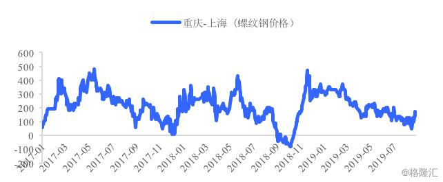 从价格来看,重庆与上海地区螺纹钢的价差难以弥补原料端铁矿石运输的价差,重庆地区钢材的生产成本较高。