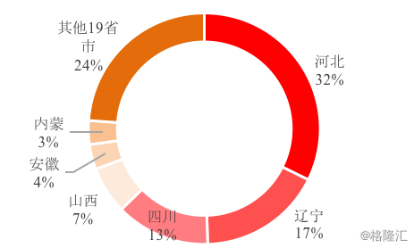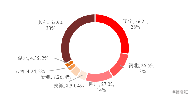 也正因为此,我国铁矿石产量以辽宁、河北和四川为主——2018年,辽宁、河北、四川铁矿产量1.32、2.46、1.00亿吨,占我国铁矿石总产量的17%、32%、13%。