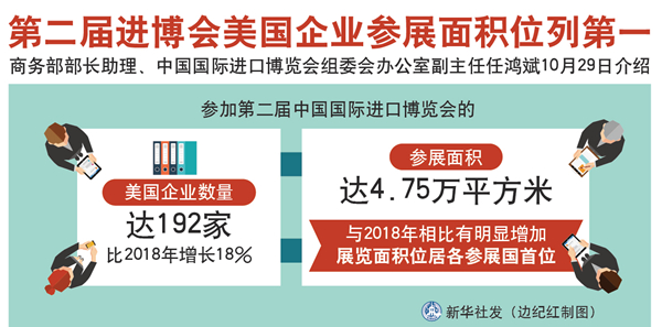 新华社北京10月29日电(记者陈炜伟、于佳欣)商务部部长助理、中国国际进口博览会组委会办公室副主任任鸿斌29日介绍,参加第二届中国国际进口博览会的美国企业数量达192家,比去年增长18%;参展面积达4.75万平方米,与去年相比有明显增加,展览面积位居各参展国首位。