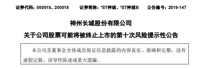 10月29日晚间,*ST神城发布关于公司股票可能将被终止上市的第十次风险提示性公告,称公司股价已连续19个交易日(2019年9月26日-2019年10月29日)收盘价格均低于股票面值(即1元)。