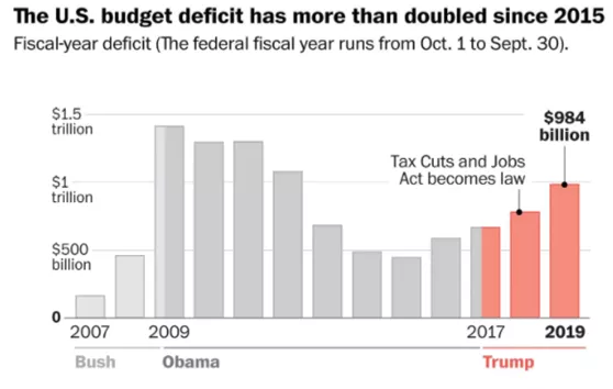 尽管美国目前处于有记录以来最长的经济扩张周期,家庭收入更多、企业利润更高,申请失业金等社保计划的人更少,且失业率位于50年来的最低点,但赤字仍在继续扩大。