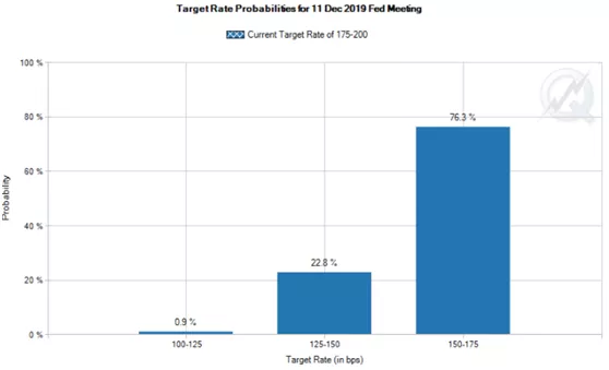 在美联储宣布降息后,芝商所“美联储观察”工具显示,截至北京时间10月31日2:19,美联储在12月11日再次降息25个基点的概率仅为22.8%,“按兵不动”的概率为76.3%。
