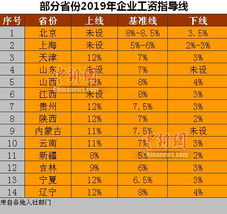 据中新网记者不完全统计,截至11月2日,至少已有北京、上海、天津、山东、山西、江西、贵州、陕西、内蒙古、云南、新疆、吉林、宁夏、辽宁等14个省区市公布了2019年企业工资指导线。