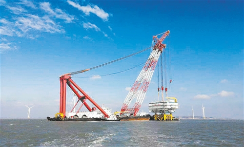 日前,福建首座220kV海上升压站“落户”三峡集团福清兴化湾海上风电场。图为国内首个将SVG动态无功补偿装置设置在海上的升压站,也是目前国内集成度最高,单体最大最重的海上升压站。 本报记者 王轶辰摄