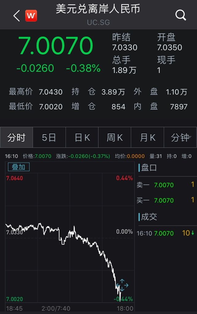 11月5日电5日午后,离岸人民币兑美元持续拉涨,升破7.00整数关口,创8月5日以来新高,日内涨逾300个基点。截至16时20分,报7.0070。
