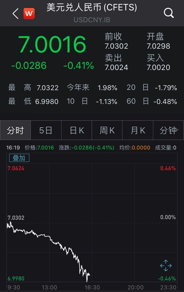 与此同时,在岸人民币兑美元同样升破7.00整数关口,截至16时20分报7.0016,亦创三个月新高。