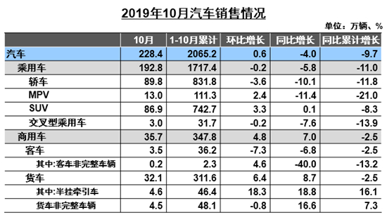 10月,乘用车销量为192.8万辆,环比微降0.2%,同比降幅缩小0.5个百分点,至5.8%;在乘用车主要品种中,多功能乘用车(MPV)和运动型多用途乘用车(SUV)销量较上月呈小幅增长,其他品种略有下降;与上年同期相比,SUV销量微增,其他三大类乘用车品种均呈下降。