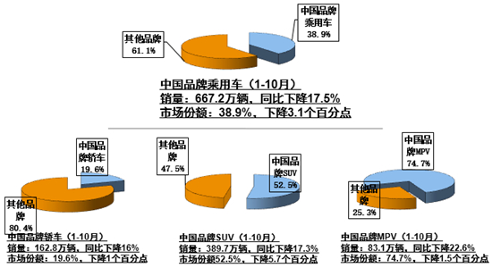 分国别来看,10月中国品牌乘用车共销售76.9万辆,环比增长5.8%,同比下降9.6%,占乘用车销售总量的39.9%,较上月微增2.3个百分点,较去年同期下降1.7个百分点。1-10月,中国品牌乘用车共销售667.2万辆,同比下降17.5%,占乘用车销售总量的38.9%,较上年同期下降3.1个百分点;1-10月,中国品牌轿车、SUV和MPV市场占有率分别为19.6%、52.5%和74.7%,依然低于同期。