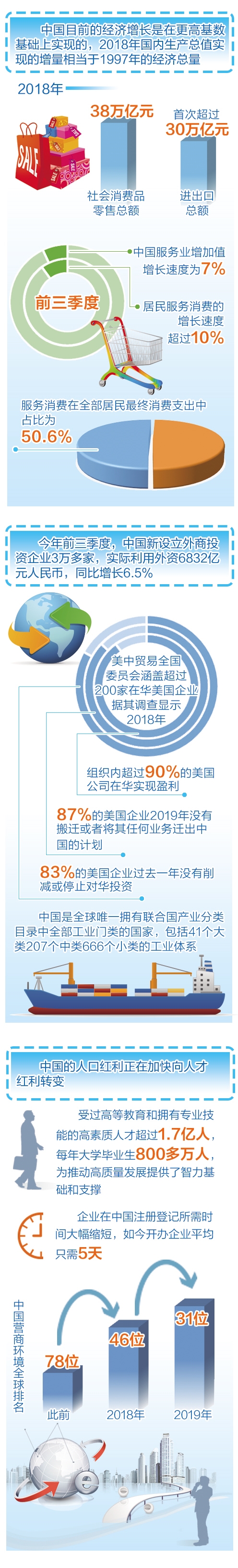 第三,从经济发展看,既要看当前态势,更要看中长期支撑。一是全球最具成长性的消费市场正在中国形成。目前,中国中等收入群体达4亿多人,农村贫困人口逐年减少,城镇化率每提高1个百分点,就有近1400万人口从农村转入城镇,居民收入稳步增加,对消费形成有力支撑。2018年,中国社会消费品零售总额达38万亿元,进出口总额首次超过30万亿元,正在向世界第一大零售市场迈进。同时,中国正在形成多层次消费市场,中高端和消费升级需求持续增长,对高品质产品和服务供给产生强大推动力;与发达国家相比,中国人均耐用消费品和公共服务水平提升的潜力很大,目前每百户家庭的汽车拥有量不到35辆,远低于美国220辆左右的水平。二是中国转型升级态势持续发展。服务业支撑能力在不断增强。前三季度,中国服务业增加值增长速度为7%,居民服务消费的增长速度超过10%,服务消费在全部居民最终消费支出中占比为50.6%,这都将为服务业快速增长发挥拉动作用,进一步提高第三产业占国内生产总值比重,不断巩固服务业“稳定器”的地位。从制造业看,高技术领域投资、短板领域投资持续保持较快增长,前三季度高技术产业投资、社会领域投资增速都在13%以上。三是中国发展动力日益增强。中国拥有近9亿劳动力人口,居民储蓄率较高,在应对复杂严峻形势的过程中,很多企业积极开拓多元化市场,加强技术研发攻关,着力挖潜降本增效,进一步夯实了中国发展的微观基础。国庆70周年等活动极大鼓舞了人心士气,增强了中国人民推动高质量发展的信心。