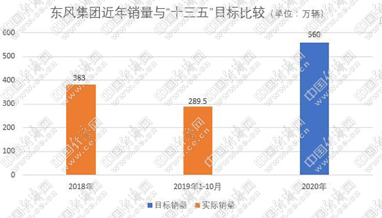 2019年1-10月,东风汽车集团累计销量为289.5万辆,同比减少5.85%,集团400万辆年度目标销量完成72.38%。以此增速估算,2019年全年销量仅能完成560万辆“十三五”目标的六成左右。