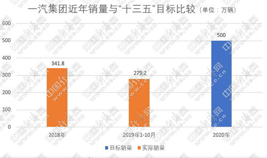 2016年4月26日,在2016中国汽车论坛的主题论坛上,中国第一汽车集团公司规划部部长付炳峰发表了一汽"十三五"规划:"总的销量将在450万辆到500万辆之间";"到2020年市场份额目标为15%以上"。