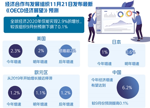 经济合作与发展组织(以下简称OECD)日前发布最新《OECD经济展望》预测:全球经济2020年仅能实现2.9%的增长,较该组织9月份预测下调了0.1%;2021年也不会超过3%,全球经济增速将进入2008年国际金融危机以来最慢时期。OECD秘书长古里亚表示:“我们正迈向这样一个未来:经济长期低增长,生活标准快速下降。”国际货币基金组织(IMF)首席经济学家郭皮纳斯认为,约七成经济体都在经历减速,全球经济正处于异常敏感时期。