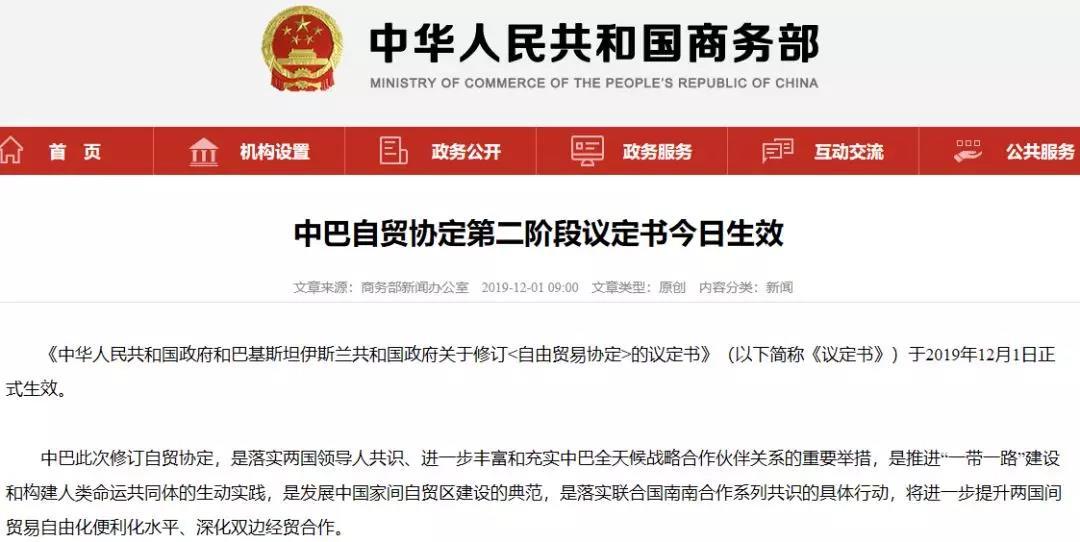 据商务部官微,《中华人民共和国政府和巴基斯坦伊斯兰共和国政府关于修订<自由贸易协定>的议定书》(以下简称《议定书》)于2019年12月1日正式生效。