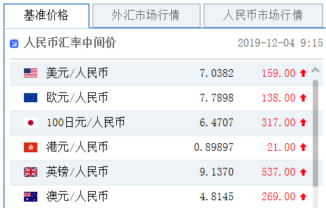 12月4日,人民币对美元中间价调贬159个基点,报7.0382,上一交易日中间价7.0223。