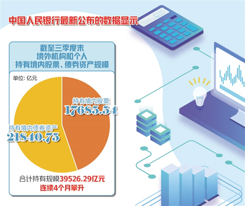 中国人民银行最新公布的数据显示,截至三季度末,境外机构和个人持有境内股票、债券资产规模分别达到17685.54亿元和21840.75亿元,合计持有规模39526.29亿元,已连续4个月攀升,并创下历史新高。