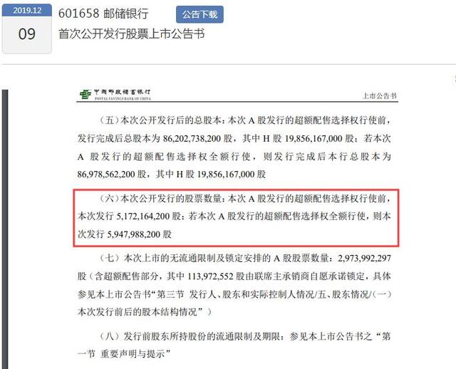 根据邮储银行8日披露的信息显示,邮储银行此次A股发行价格为5.50元/股,战略配售最终发行股票数量为20.69亿股,网下发行最终股票数量为12.93亿股,网上发行最终发行股票数量为25.86亿股(含超额配售部分)。