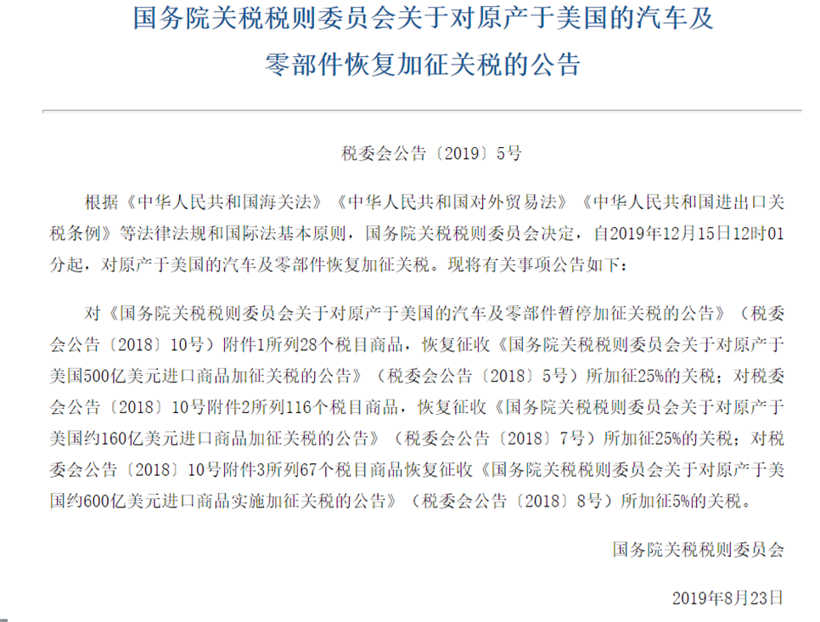 众所周知,国务院关税税则委员会于今年8月23日发布的《关于对原产于美国的汽车及零部件恢复加征关税的公告》决定,自2019年12月15日12时01分起,中国对原产于美国的汽车及零部件恢复加征关税。