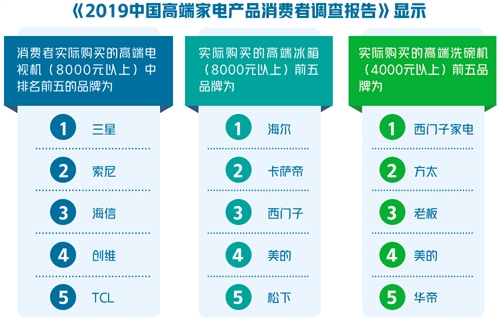 12月13日,由中国家用电器协会指导、红顶奖组委会主办的“第11届中国高端家电趋势发布暨红顶奖颁奖盛典”在北京举行。红顶奖组委会最新发布的《2019中国高端家电产品消费者调查报告》显示,消费者实际购买的高端电视机(8000元以上)中排名前五的品牌为三星、索尼、海信、创维、TCL;实际购买的高端冰箱(8000元以上)前五品牌为海尔、卡萨帝、西门子、美的、松下;实际购买的高端洗碗机(4000元以上)前五品牌为西门子家电、方太、老板、美的、华帝。