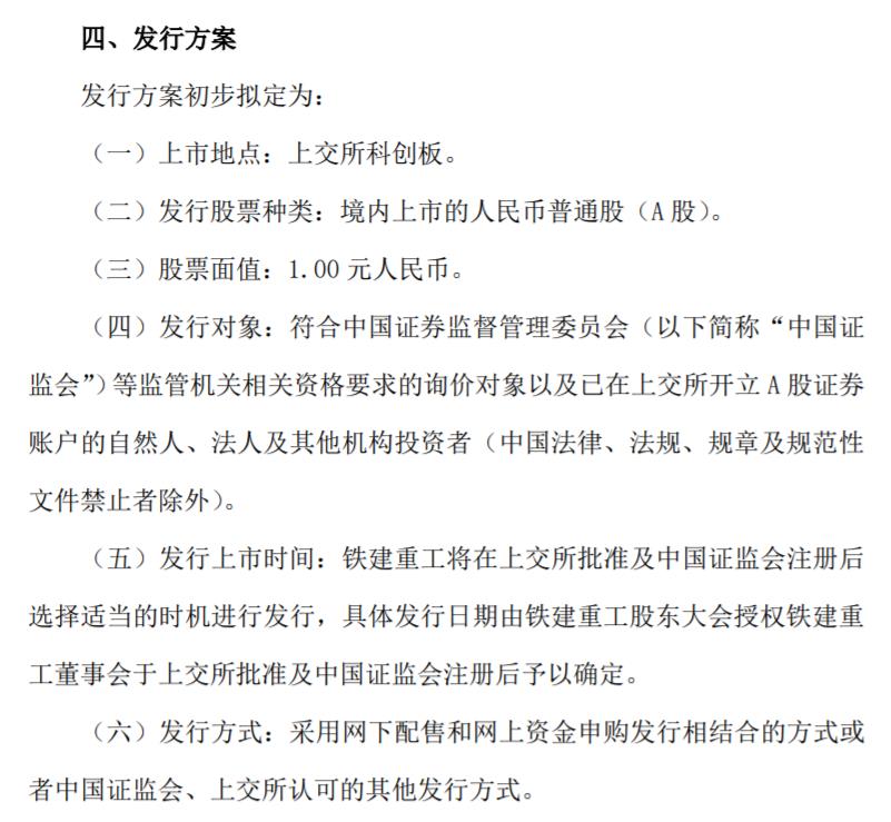 根据发行方案,铁建重工拟上市地点为上交所科创板,股票面值为1元。