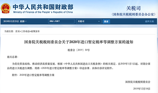 2020年进口暂定税率等调整方案