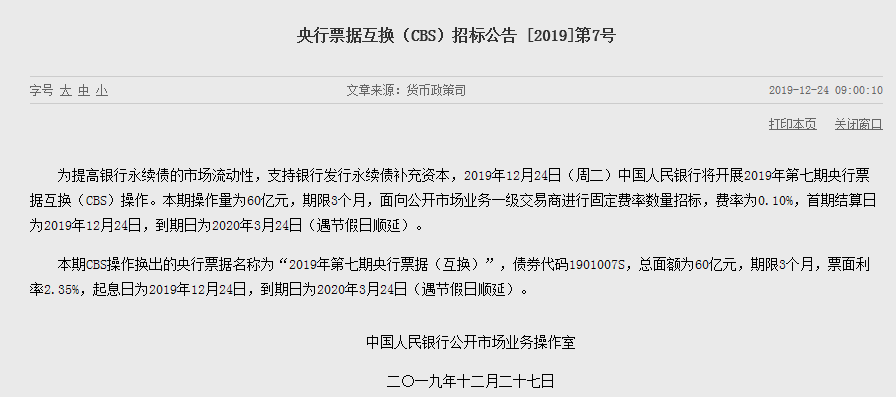 据央行公告,为提高银行永续债的市场流动性,支持银行发行永续债补充资本,2019年12月24日(周二)中国人民银行将开展2019年第七期央行票据互换(CBS)操作。本期操作量为60亿元,期限3个月,面向公开市场业务一级交易商进行固定费率数量招标,费率为0.10%,首期结算日为2019年12月24日,到期日为2020年3月24日(遇节假日顺延)。